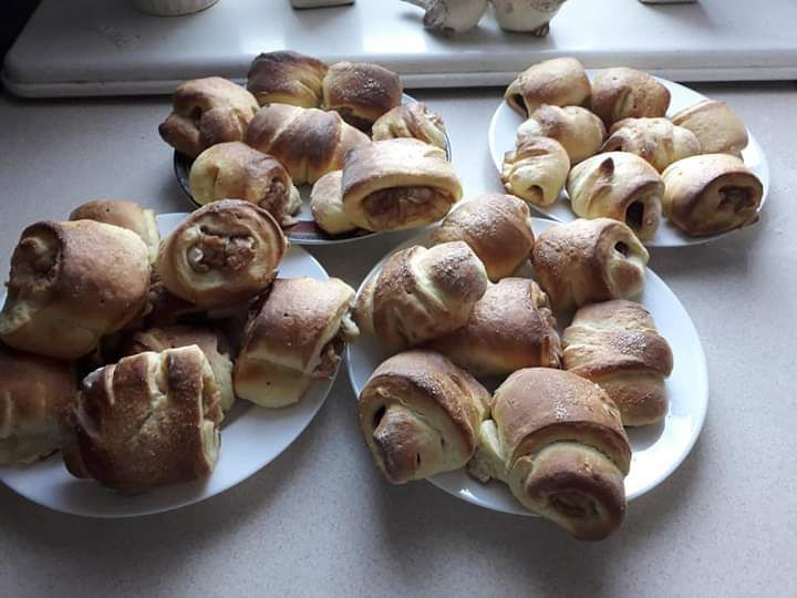Farsz: jabłka starte na plastry, cukier, cynamon -podsmażyć, dodać bułki tartej, wystudzić.